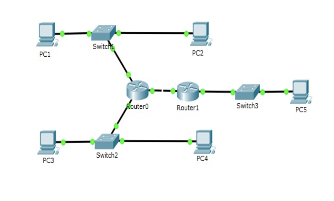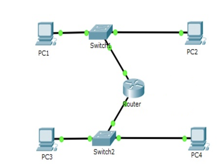 4. Создана сеть из четырёх компьютеров, двух коммутаторов и маршрутизатора: